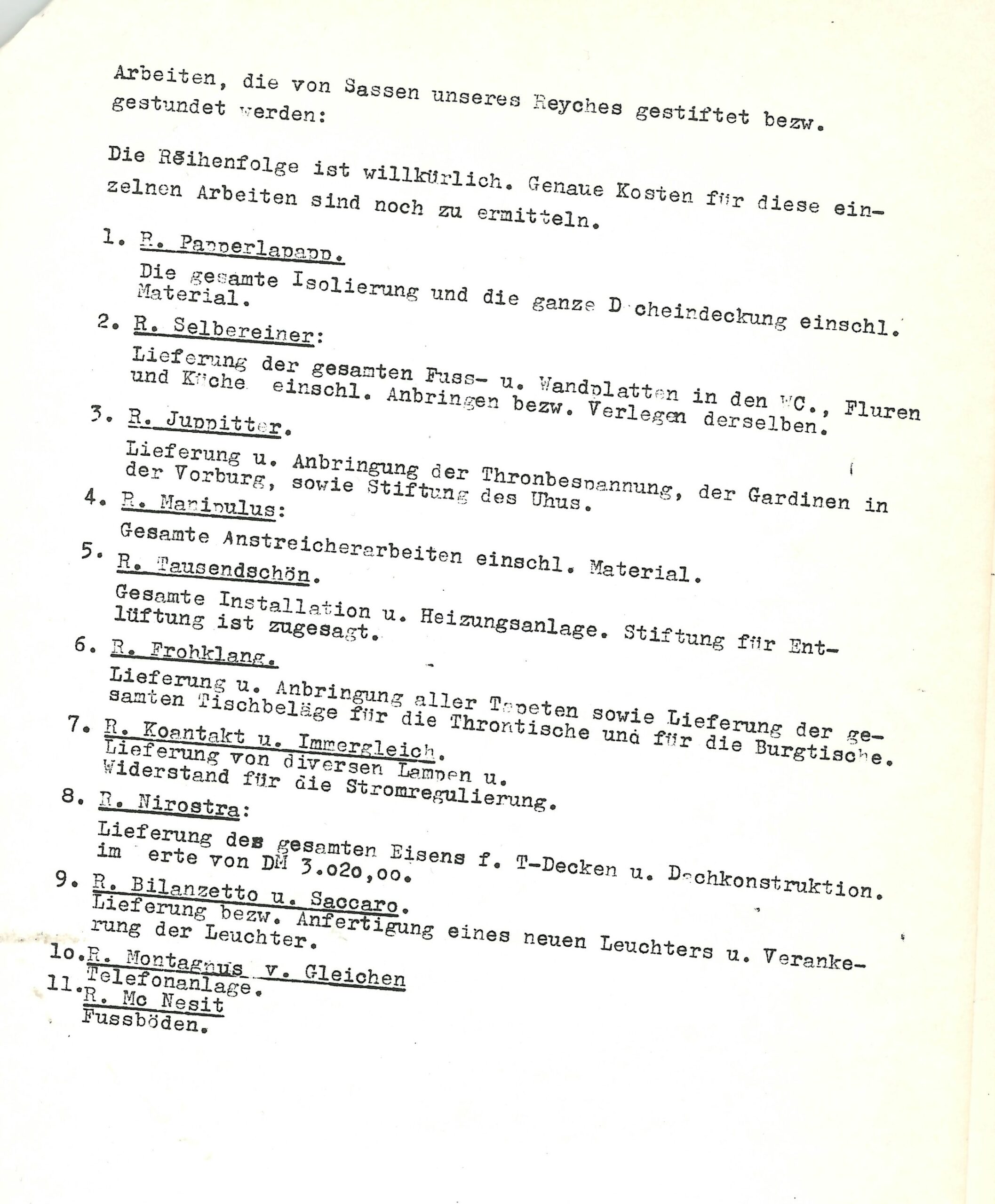 Die Kosten von 35.000 D-Mark (ca. 100.000 Euro) wurden zu zwei Dritteln durch Materialspenden und Arbeitseinsatz der Sassen gedeckt. Wenn man sich die Ritternamen und die gespendeten Materialien anschaut, dann ist es bei einigen nicht schwer, auf den profanen Beruf des Sassen zu schließen, z.B. Ritter Papperlapp, der die Dachpappe stiftete oder Ritter Nirostra, der die Eisenträger für die Decke beitrug.