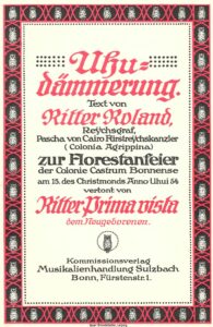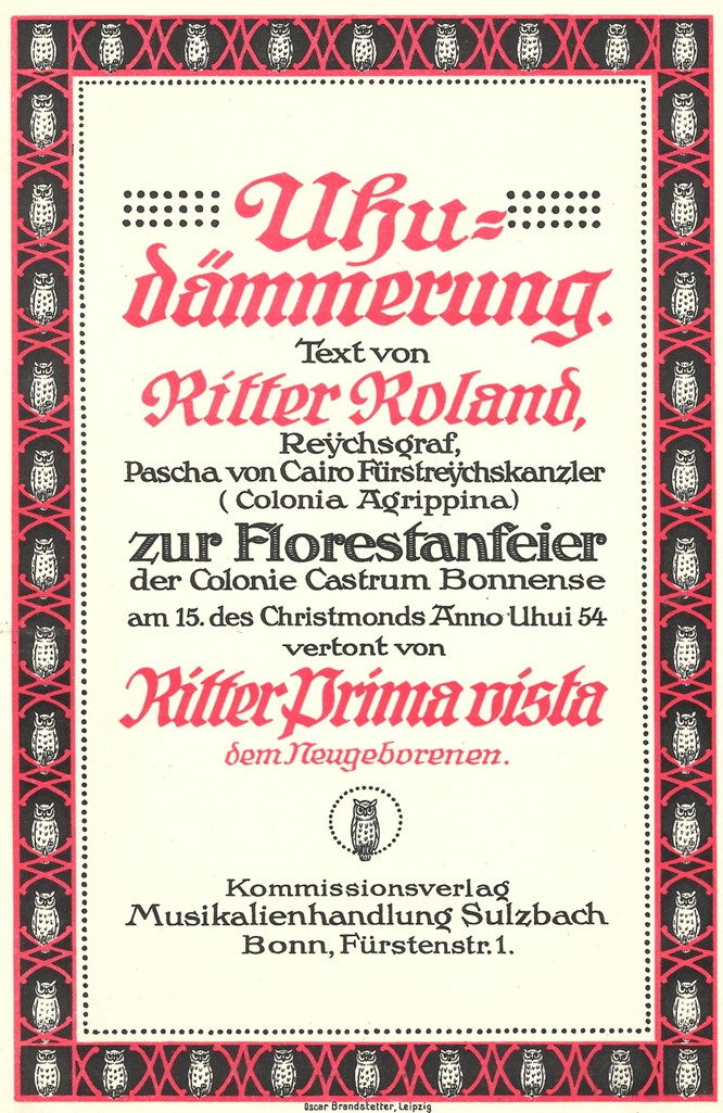 Diese Burg wurde nicht nur unser Zuhause, sondern auch der Ausgangspunkt einer besonderen Tradition. Die erste Florestanfeyer wurde bereits vor der offiziellen Gründung begangen. Sie fand am 15. Dezember 1913 statt. Dafür schufen zwei Schlaraffen ein eigenes Werk: ‘Uhudämmerung’. Ritter Roland aus der Mutter Colonia Agrippina schrieb den Text. Ritter Prima Vista war damals Leiter des Beethoven-Orchesters und komponierte die Musik.